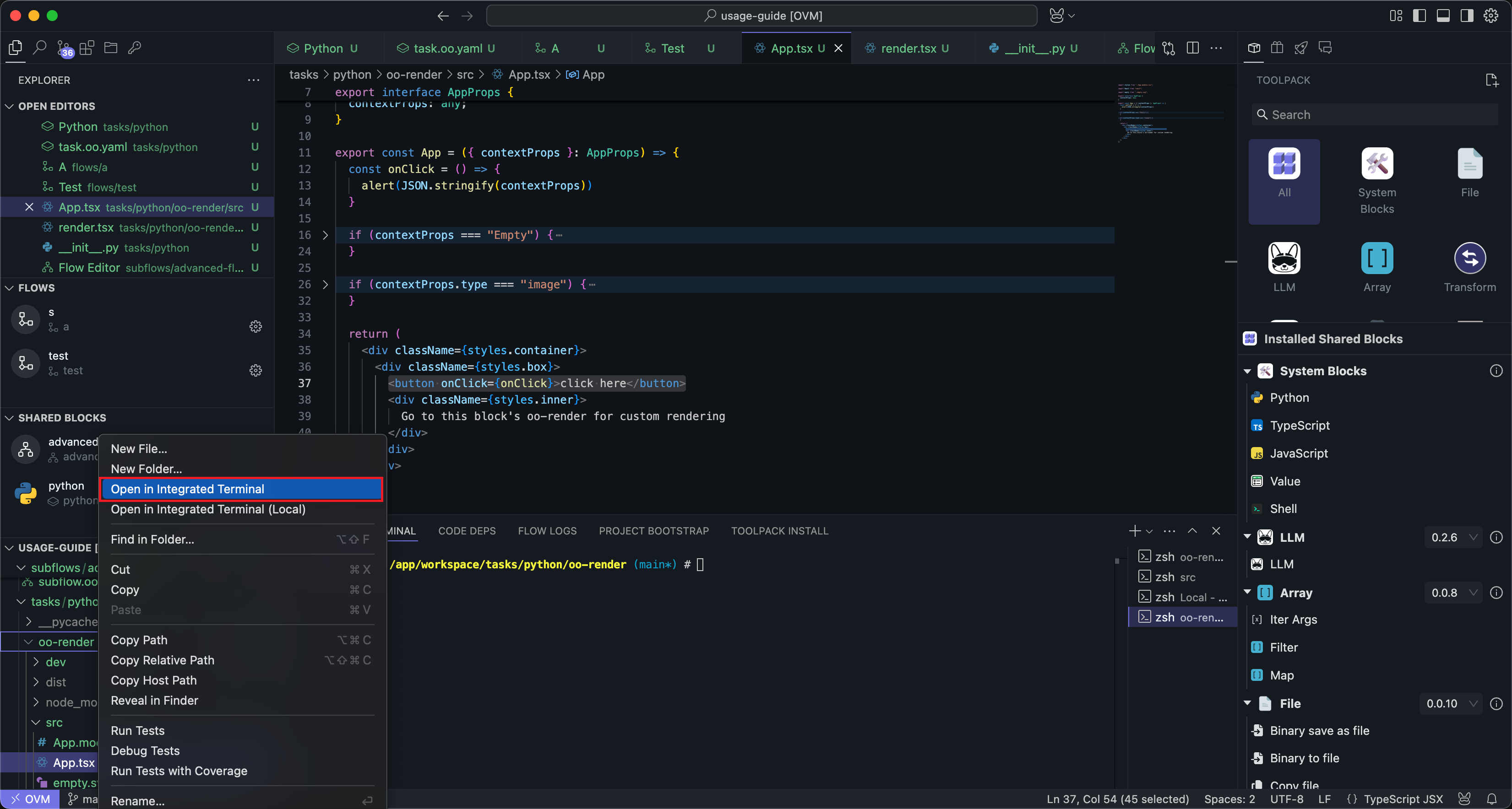 After clicking the Create button under Custom UI in the Block configuration panel, wait for a moment, and OOMOL Studio will automatically initialize a set of UI template code.