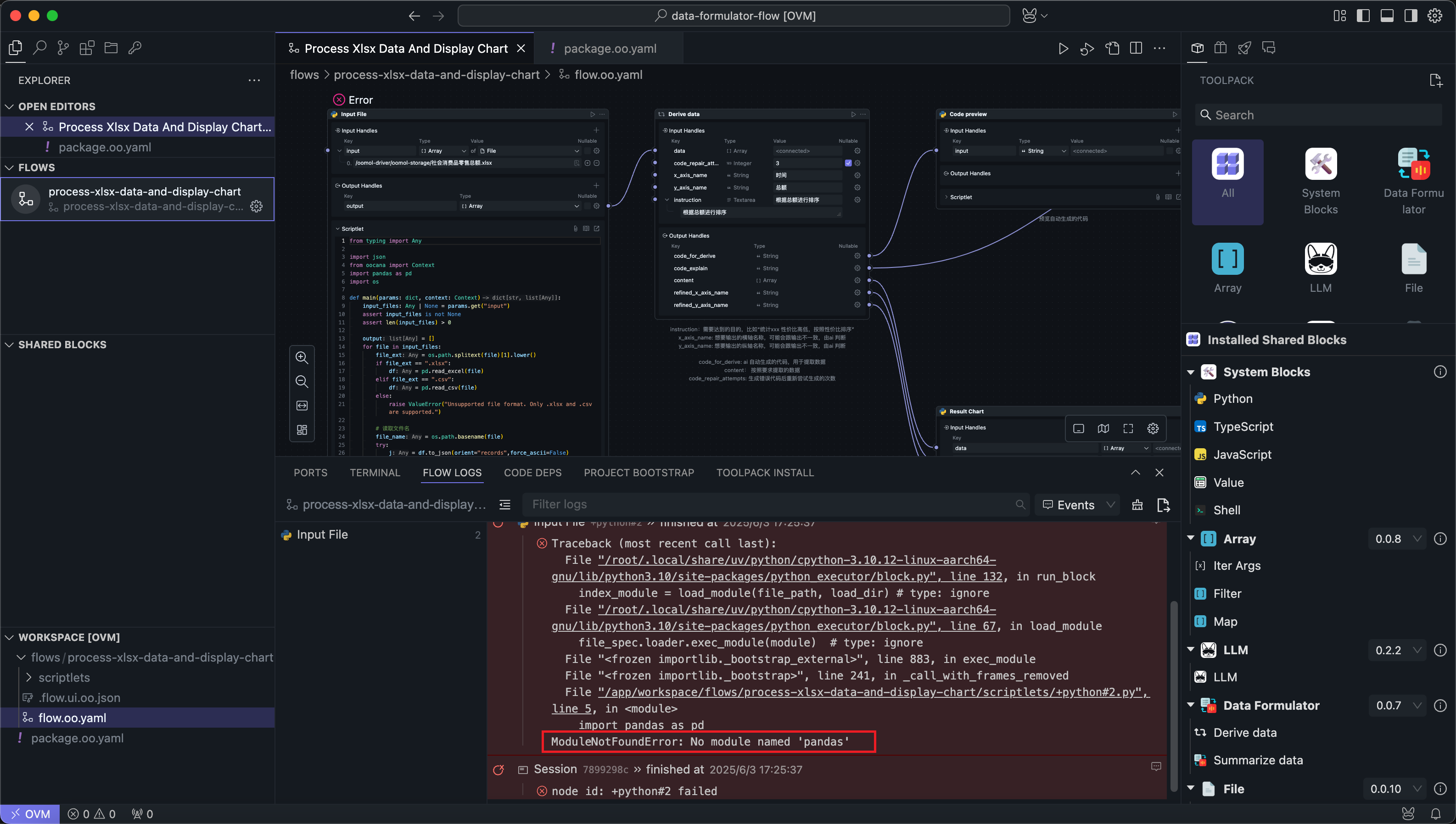 After opening a community project, users find that the flow uses script blocks, but during runtime, they discover that the modules required by the script blocks cannot be found.